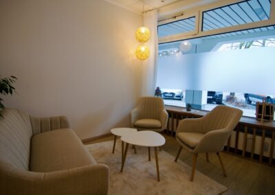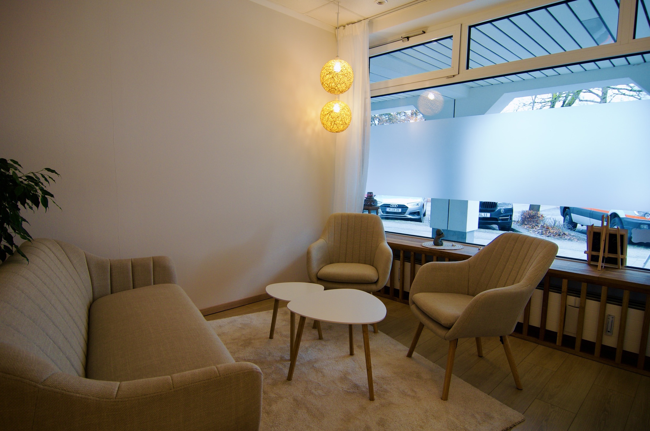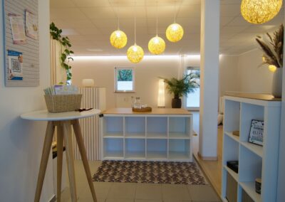 Auf ca. 80 qm findest du einen einladenden Eingangsbereich mit Garderobe, einen gemütlichen Sitzbereich (Sofa + zwei Sessel) sowie einen großen Saal für vielfältige Schulungs- und Trainingsformate.